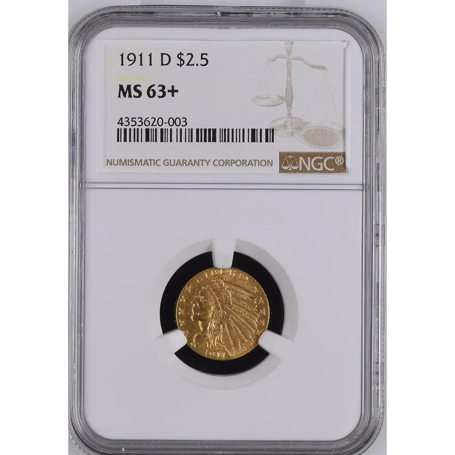 1911-D Gold Quarter Eagles $2 1/2 Indian Head NGC MS-63+ STRONG D